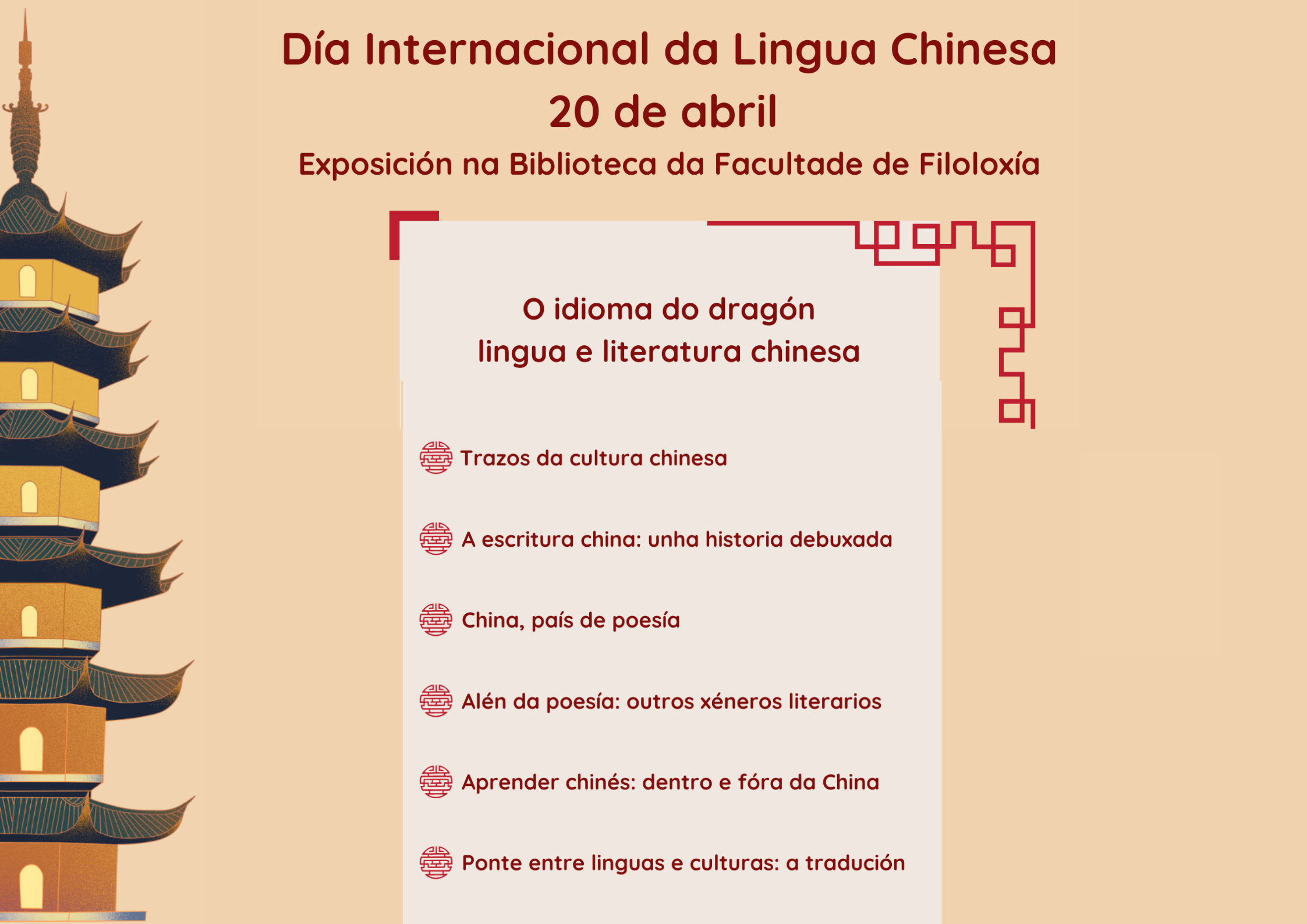 Co gallo do Día Internacional da Lingua Chinesa (20 de abril), o alumno da Facultade de Filoloxía, Christopher Luongo, organizou esta exposición con libros e diversos obxectos sobre a cultura, literatura e lingua desta civilización milenaria.
