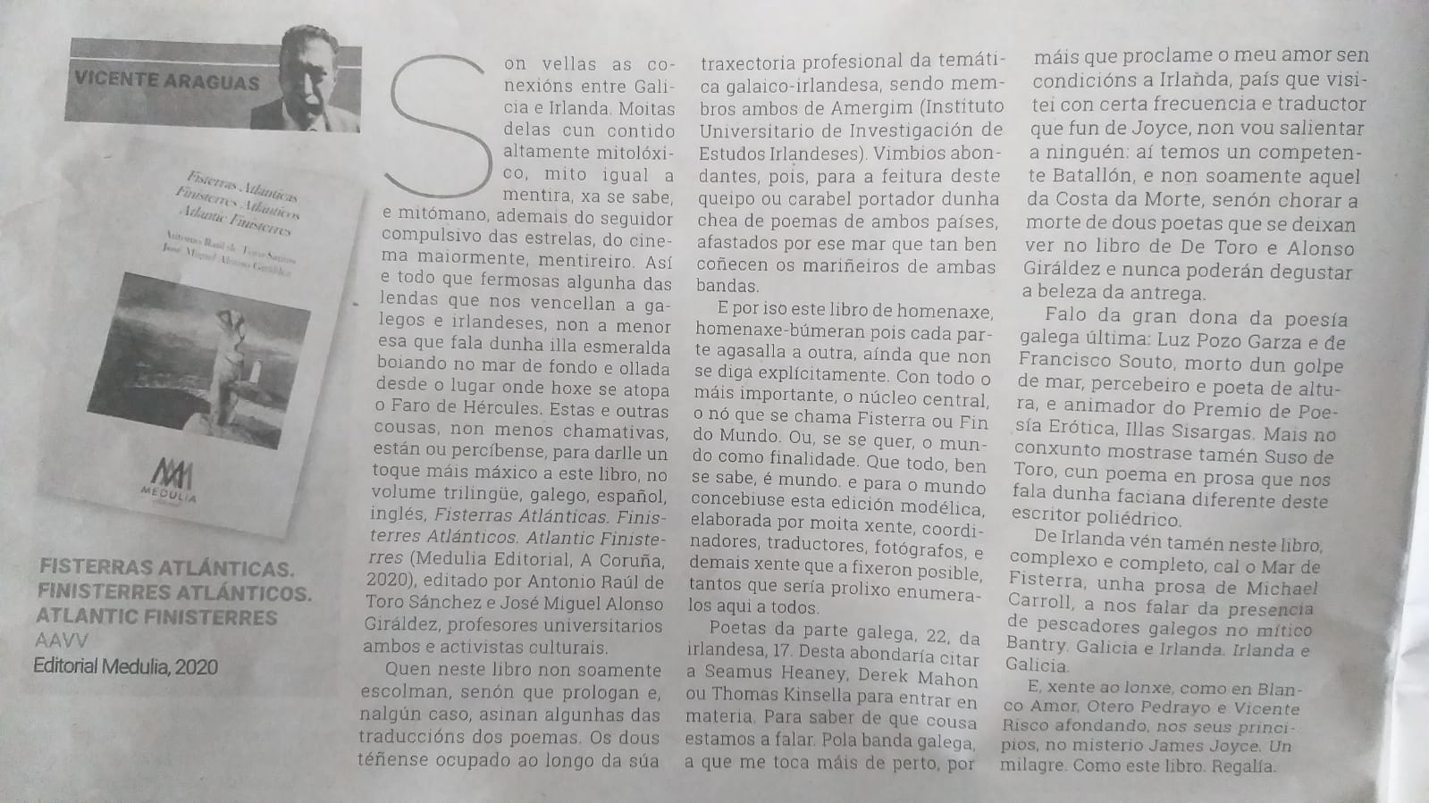 Foi un momento máxico. Levabamos baixo o brazo, recentemente saído do prelo, un volume de poemas (e algún texto en prosa) de máis de 250 páxinas que, en realidade, era un cofre cun tesouro no seu interior: 39 autores galegos e irlandeses. É un libro sobre o océano. Sobre a relación das persoas co mar, como lugar simbólico e metafórico, como territorio do fin do mundo, pero tamén como roteiro doméstico, no que as ideas, a arte e as mercadorías circularon entre ondas embravecidas e naufraxios abundantes desde a Prehistoria. A presenza do Atlántico moldea a cotío a nosa vida, como a vida dos irlandeses, constrúe o noso carácter, mais tamén a nosa maneira de ver o mundo. Somos fillos do mar.