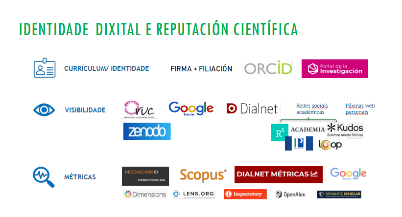 • Existen ferramentas que recollen parte do noso traballo e ofrecen métricas. É parte do noso traballo facilitar a avaliacion por parte dos distintos axentes do mundo científico (institucións, axencias de financiamento e gubernamentais) sabendo xestionar os nosos perfís nesas ferramentas para que a nosa produción científica non se disperse e os indicadores que se recollen nelas nos beneficien.