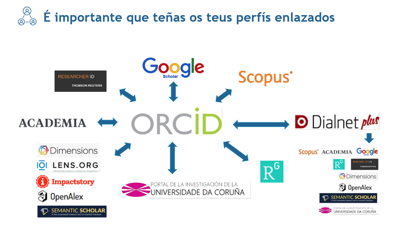 • Realiza un mantemento do resto identificadores e perfís de autoría: As bases de datos donde se indexan os teus traballos xeran automáticamente uns perfís máis ou menos autoxestionables (en canto á información persoal e a reclamación/eliminación de traballos), ainda que ás veces necesitan mediación. Acostúmate a manter estes perfís actualizados, como mínimo os más importantes: Researcher ID (WoS), Scopus ID, Dialnet ID, ou mesmo Dimensions porque son fonte de alimentación do Portal da investigación de la UDC e porque ofrecen métricas valoradas nos procesos de evaluación da ciencia. Outros perfís interesantes para as métricas, ainda que secundarios, que reclamar e xestionar serían ImpactStory, Lens, OpenAlex ou Semantic Scholar. Ter perfil en Google Scholar é interesante tamén de cara á visibilidade.