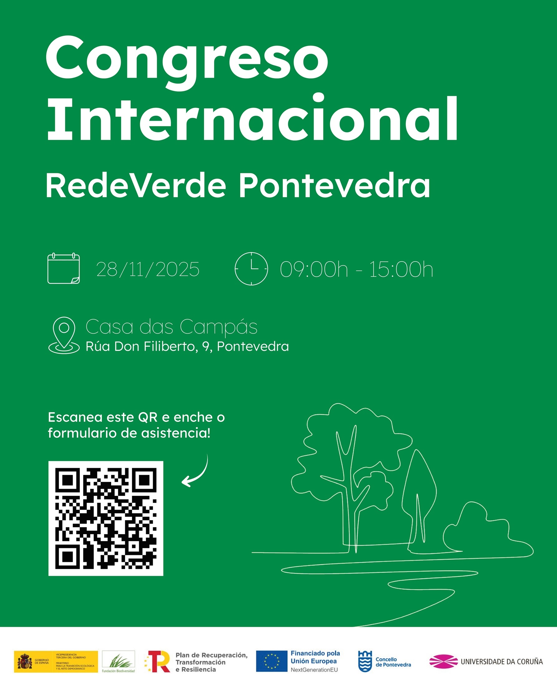 A Coruña, 26 de novembro de 2025.- A Universidade da Coruña (UDC), en colaboración co Concello de Pontevedra, organiza o Congreso Internacional RedeVerde Pontevedra, que se centrará na renaturalización das cidades e a súa adaptación ao cambio climático a través de diversas solucións baseadas na natureza. Este evento forma parte das actividades de gobernanza e participación do Proxecto RedeVerde Pontevedra, que inclúen sesións de formación para técnicos e divulgación ao público sobre temas relacionados coas infraestruturas verdes. O proxecto conta co apoio da Fundación Biodiversidad do Ministerio para la Transición Ecológica y el Reto Demográfico (MITECO) no marco do Plan de Recuperación, Transformación y Resiliencia (PRTR), financiado polo programa Next Generation EU da Unión Europea.