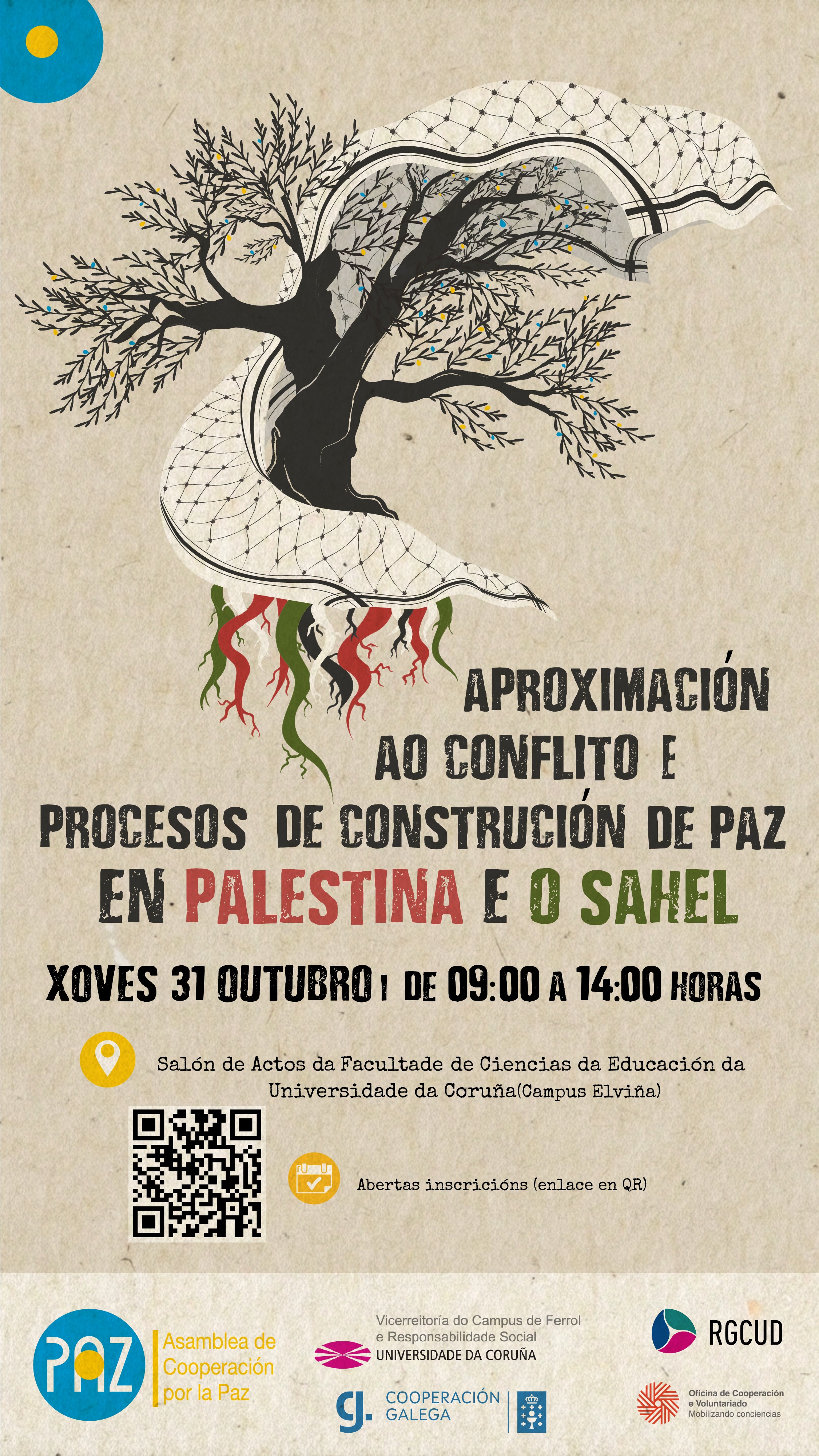 A Oficina de Cooperación e Voluntariado e Asamblea de Cooperación por la Paz propoñen esta xornada para indagar sobre o conflito de Palestina, ofrecendo unha visión interdisciplinar e global do mesmo, que non esté centrada unicamente nos acontecementos derivados da situación actual, senón no contexto histórico e xeopolítico, facendo fincapé nas obligacións desatendidas da comunidade internacional para co pobo palestino no marco do DIH e o DIDH.