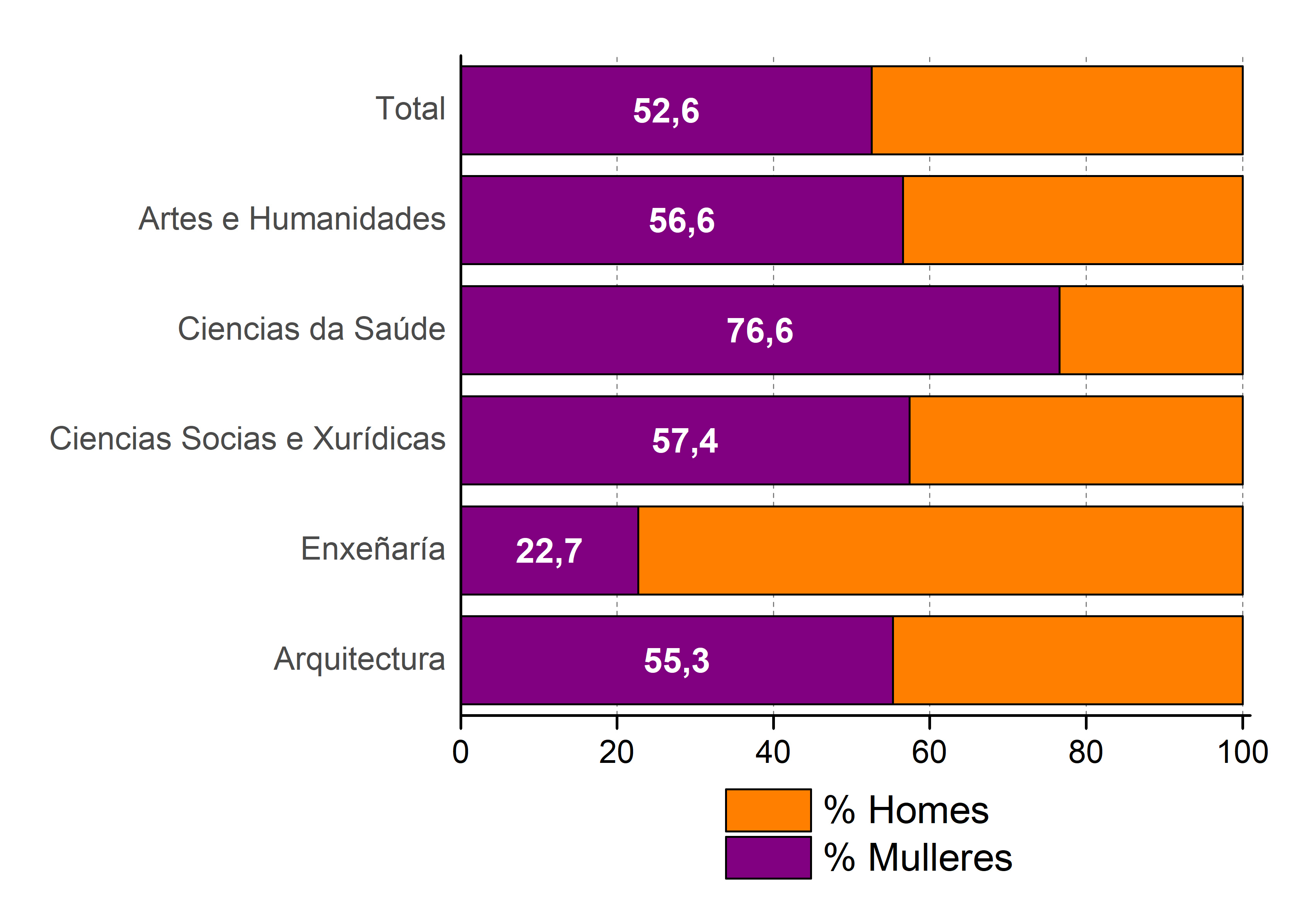 Aínda que non existen diferenzas significativas entre o número de alumnas e alumnos que entran na nosa universidade, obsérvanse importantes desequilibrios de xénero entre titulacións de distintas áreas de coñecemento. As mulleres son claramente maioría nas titulacións de ciencias da saúde (historicamente vinculadas aos coidados), mentres que os graos en enxeñaría (que dan acceso a traballos mellor remunerados e de maior recoñecemento social) están altamente masculinizados.