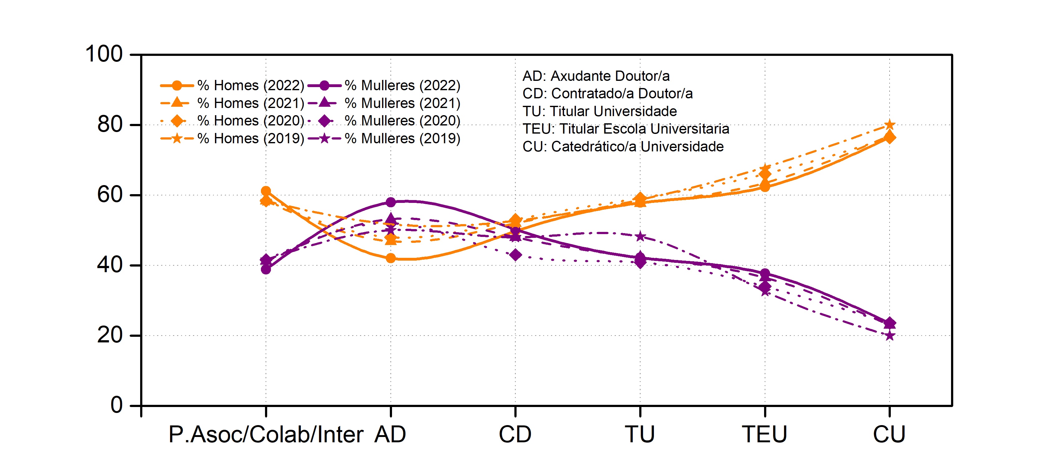 No que respecta ao persoal docente e investigador (PDI) da Universidade da Coruña, os últimos datos indican que as mulleres constitúen ao redor do 40%, pero tan só supoñen o 20 % na categoría máis alta da carreira universitaria (catedráticas).