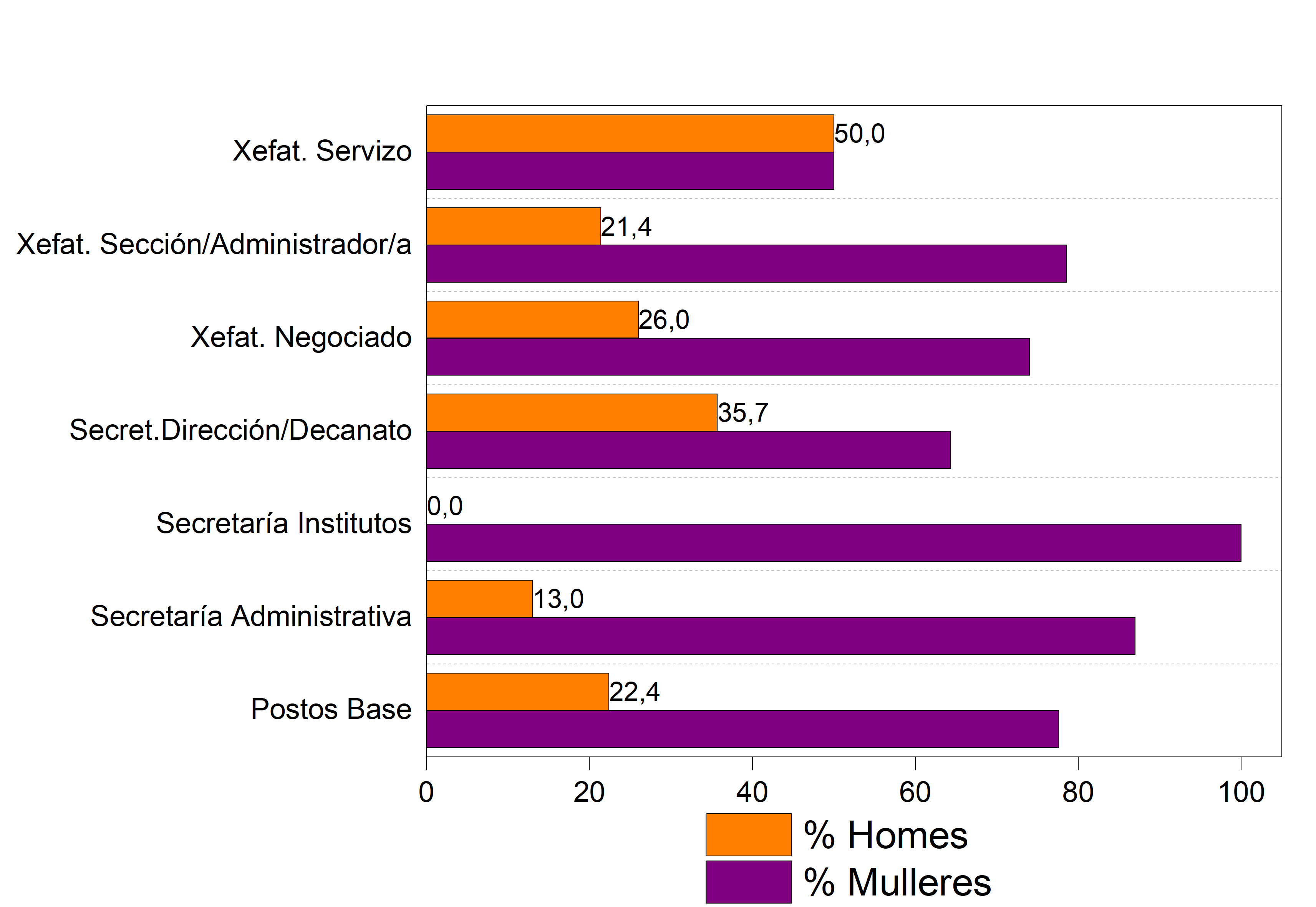 No que respecta ao persoal técnico, de xestión e de administración e servizos (PTXAS), con maioría de mulleres (concretamente, na escala xeral eran o 77% no ano 2022), a proporción non se mantén cando ascendemos ás categorías superiores: por exemplo, nas xefaturas de servicio as mulleres só representan o 50%.