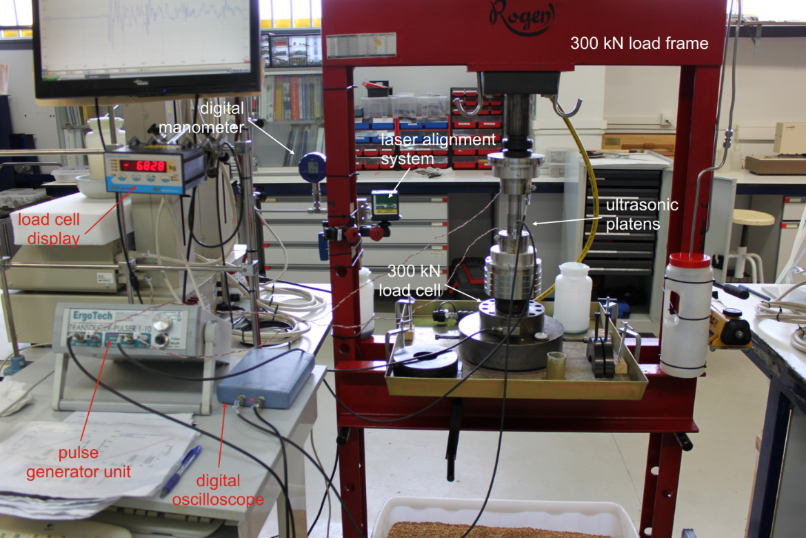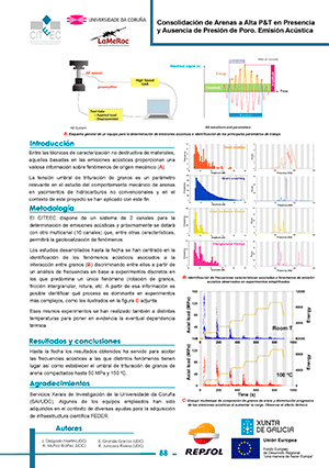 Entre las técnicas de caracterización no destructiva de materiales, aquellas basadas en las emisiones acústicas proporcionan una valiosa información sobre fenómenos de origen mecánico (A). La tensión umbral de trituración de granos es un parámetro relevante en el estudio del comportamiento mecánico de arenas en yacimientos de hidrocarburos no convencionales y en el contexto de este proyecto se han aplicado con este fin.