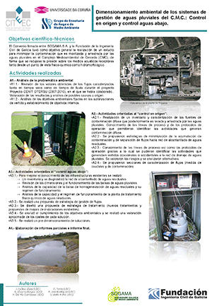 El Convenio firmado entre SOGAMA S.A. y la Fundación de la Ingeniería Civil de Galicia tuvo como objetivo general la realización de un estudio para minimizar la contaminación que es movilizada y arrastrada por las aguas pluviales en el Complejo Medioambiental de Cerceda (CMC), de forma que se redujese la presión sobre los medios acuáticos receptores tanto desde un punto de vista físico-químico como hidromorfológico