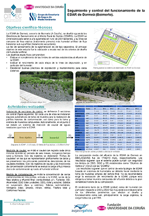 La EDAR de Dormeá, concello de Boimorto (A Coruña), se diseñó siguiendo las Directrices de Saneamiento en el Medio Rural de Galicia (DSMRG). La EDAR se dimensionó para servir a una aglomeración rural de 200 habitantes, y su línea se compone de fosa séptica (tratamiento primario) más humedal artificial de flujo horizontal sub-superficial (tratamiento secundario).
