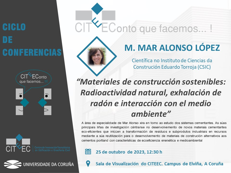 A sala de Visualización do CITEEC (Campus de Elviña) contará cunha charla impartida por Mar Alonso, científica Titular do departamento de Materiais do Instituto de Ciencias de la Construción Eduardo Torroja, do Consello Superior de Investigacións Científicas (CSIC), directora do Consello de Redacción de la revista científica “Materiales de Construcción” desde 2019 e integrante da Scientific and Innovation Advisory Board do CITEEC, un dos órganos encargados de avaliar a traxectoria do centro.