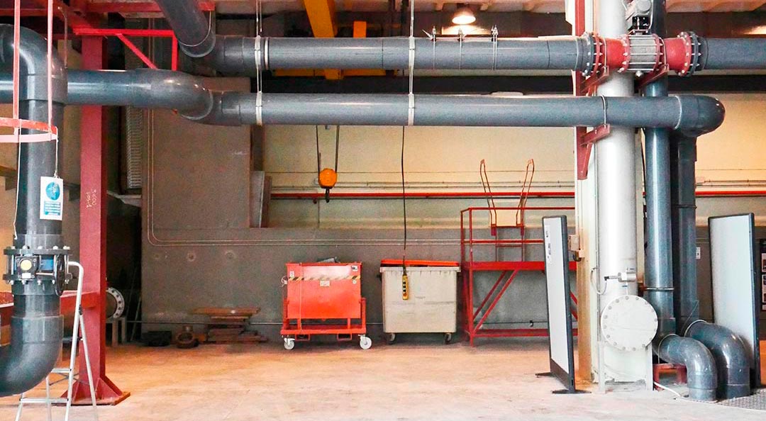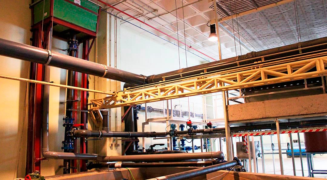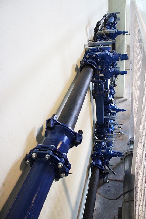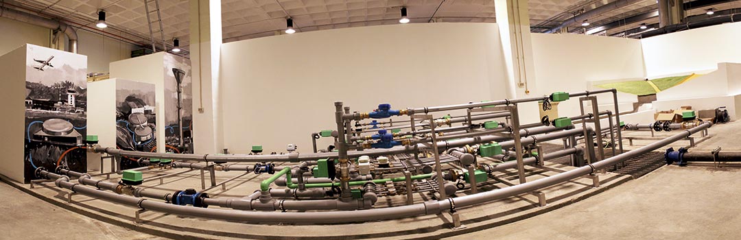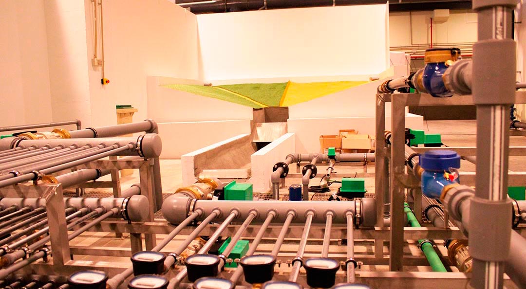 Red de tuberías a presión para el estudio de pérdidas de carga en conexiones de sistemas de abastecimiento. La instalación se utiliza además para la realización de prácticas docentes en las que se explica de manera muy visual y práctica el funcionamiento de circuitos de tuberías a presión y las pérdidas de carga que se producen en este tipo de sistemas.