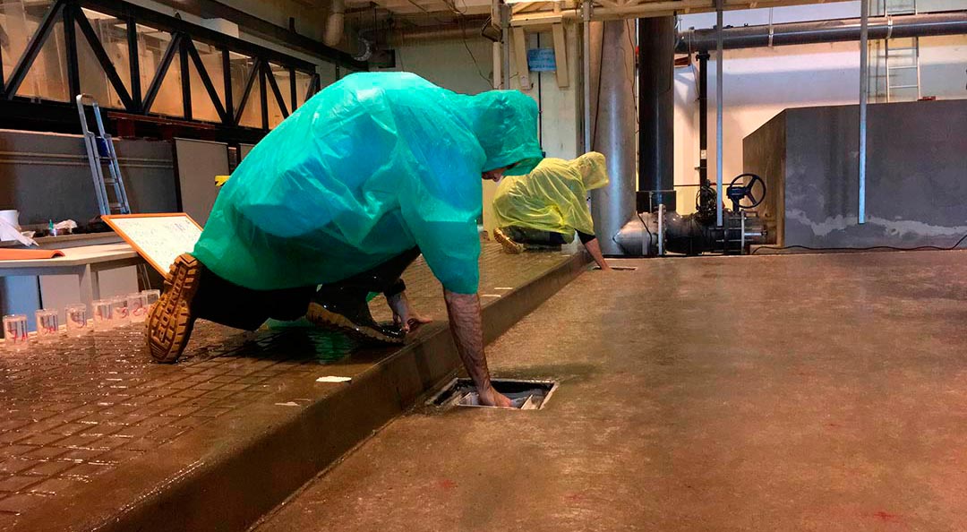 Modelo a escala real de una intersección urbana para el estudio del proceso de transformación lluvia-escorrentía y movilización de contaminantes en superficie y a través de la red de colectores. Las características del modelo, que tiene una superficie total de 100 m2, son las siguientes: