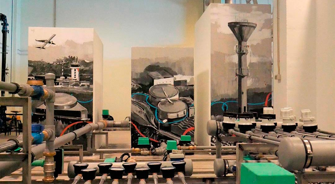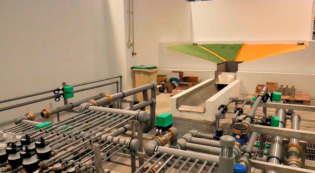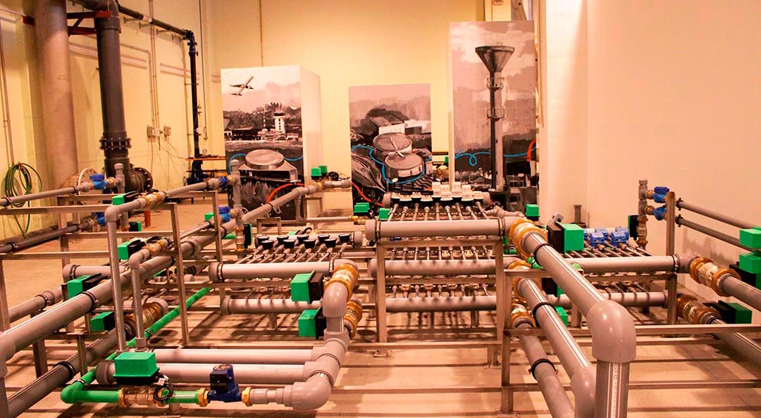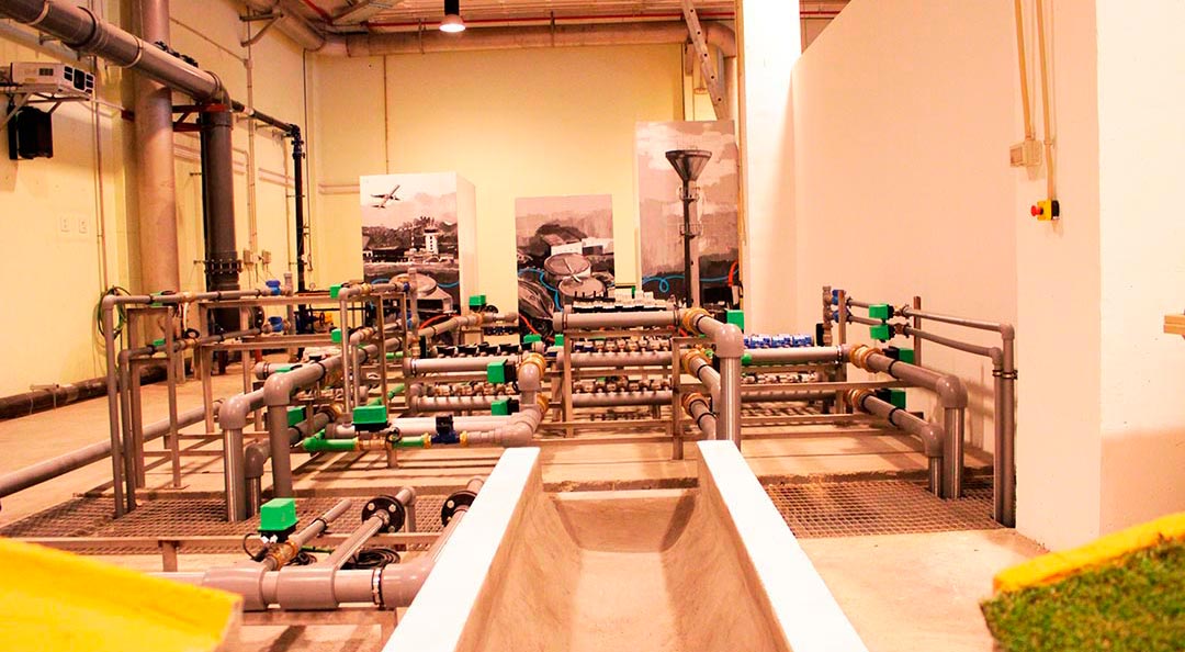 Modelo conceptual que representa el funcionamiento de la gestión urbana del agua en la ciudad de A Coruña. La instalación está compuesta por una cuenca de aportación, un embalse y una ETAP en cabecera. A continuación, el agua es distribuida por una red de tuberías con una gran cantidad de sensores para el control de los consumos de los distintos sectores en la ciudad. Finalmente, la instalación cuenta con una EDAR aguas abajo del modelo desde la que se recircula el agua. Además de su carácter divulgativo, el gran números de equipos de medida con los que cuenta el modelo es gestionado mediante sistemas avanzados TICs que permitirán desarrollar nuevas estrategias de gestión basadas en la aplicación de Inteligencia Artificial y Machine Learning.