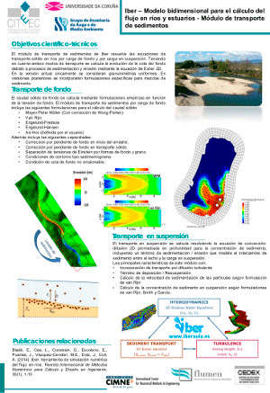 El módulo de transporte de sedimentos de Iber resuelve las ecuaciones de transporte sólido en ríos por carga de fondo y por carga en suspensión. Teniendo en cuenta ambos modos de transporte se calcula la evolución de la cota del fondo debido a procesos de sedimentación y erosión mediante la ecuación de Exner 2D. En la versión actual únicamente se consideran granulometrías uniformes. En versiones posteriores se incorporarán formulaciones específicas para mezclas de sedimento.