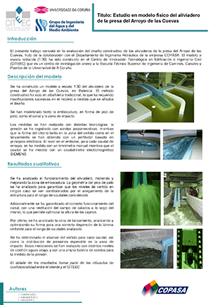 El presente trabajo consiste en la evaluación del diseño constructivo de los aliviaderos de la presa del Arroyo de las Cuevas, fruto de la colaboración con el Departamento de Ingeniería Hidráulica de la empresa COPASA. El modelo a escala reducida (1:30) ha sido construido en el Centro de Innovación Tecnológica en Edificación e Ingeniería Civil (CITEEC) que es un centro de investigación anexo a la Escuela Técnica Superior de Ingeniería de Caminos, Canales y Puertos de la Universidade da Coruña.