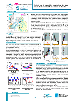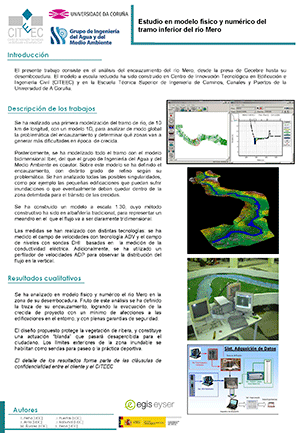 El presente trabajo consiste en el análisis del encauzamiento del río Mero, desde la presa de Cecebre hasta su desembocadura. El modelo a escala reducida ha sido construido en Centro de Innovación Tecnológica en Edificación e Ingeniería Civil (CITEEC) y en la Escuela Técnica Superior de Ingeniería de Caminos, Canales y Puertos de la Universidade da Coruña.