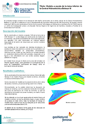 El presente trabajo consiste en la evaluación del diseño constructivo de la toma inferior de la Central Hidroeléctrica Belesar III, fruto de la colaboración con el departamento de Ingeniería Hidráulica de GNF Enginering. El modelo a escala reducida (1:40) ha sido construido en Centro de Innovación Tecnológica en Edificación e Ingeniería Civil (CITEEC) que es un centro de investigación anexo a la Escuela Técnica Superior de Ingeniería de Caminos, Canales y Puertos de la Universidade da Coruña.