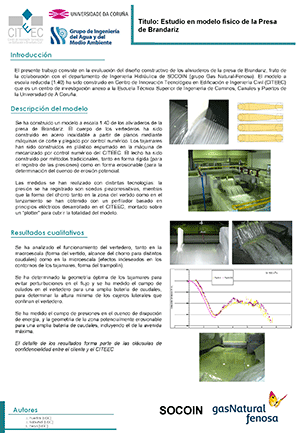 El presente trabajo consiste en la evaluación del diseño constructivo de los aliviaderos de la presa de Brandariz, fruto de la colaboración con el departamento de Ingeniería Hidráulica de SOCOIN (grupo Gas Natural-Fenosa). El modelo a escala reducida (1:40) ha sido construido en Centro de Innovación Tecnológica en Edificación e Ingeniería Civil (CITEEC) que es un centro de investigación anexo a la Escuela Técnica Superior de Ingeniería de Caminos, Canales y Puertos de la Universidade da Coruña.