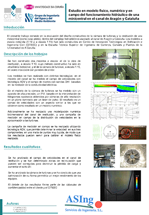 El presente trabajo consiste en la evaluación del diseño constructivo de la cámara de turbinas y la restitución de una minicentral (como caso piloto), dentro del complejo hidroeléctrico asociado al canal de Aragón y Cataluña. Los modelos a escala reducida (1:10 y a escala 1:15) han sido construidos en Centro de Innovación Tecnológica en Edificación e Ingeniería Civil (CITEEC) y en la Escuela Técnica Superior de Ingeniería de Caminos, Canales y Puertos de la Universidade da Coruña.