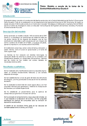 El presente trabajo consiste en la evaluación del diseño constructivo de la Central Hidroeléctrica de Ocaña II (Provincia de Cañar-Ecuador), fruto de la colaboración con el departamento de Ingeniería Hidráulica de GNF Enginering. El modelo a escala reducida (1:40) ha sido construido en Centro de Innovación Tecnológica en Edificación e Ingeniería Civil (CITEEC) que es un centro de investigación anexo a la Escuela Técnica Superior de Ingeniería de Caminos, Canales y Puertos de la Universidade da Coruña.