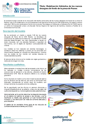 El presente trabajo consiste en la evaluación del diseño constructivo de los nuevos desagües de fondo de la presa de Peares, fruto de la colaboración con el departamento de Ingeniería Hidráulica de GNF Engineering. El modelo a escala reducida (1:30) ha sido construido en Centro de Innovación Tecnológica en Edificación e Ingeniería Civil (CITEEC) que es un centro de investigación anexo a la Escuela Técnica Superior de Ingeniería de Caminos, Canales y Puertos de la Universidade da Coruña.