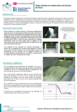El presente trabajo consiste en la evaluación del diseño constructivo de los aliviaderos de la presa de Touro, fruto de la colaboración con el departamento de Ingeniería Hidráulica de la empresa Patrimonio Hidroeléctrico de Galicia S.L. El modelo a escala reducida (1:40) ha sido construido en Centro de Innovación Tecnológica en Edificación e Ingeniería Civil (CITEEC) que es un centro de investigación anexo a la Escuela Técnica Superior de Ingeniería de Caminos, Canales y Puertos de la Universidade da Coruña.
