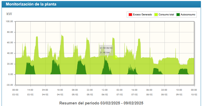 Na gráfica adxunta poden verse resultados reais da xeración en valores de potencia dos primeiros días de funcionamento, sendo a curva verde escura a xeración fronte a verde clara que sería o consumo.