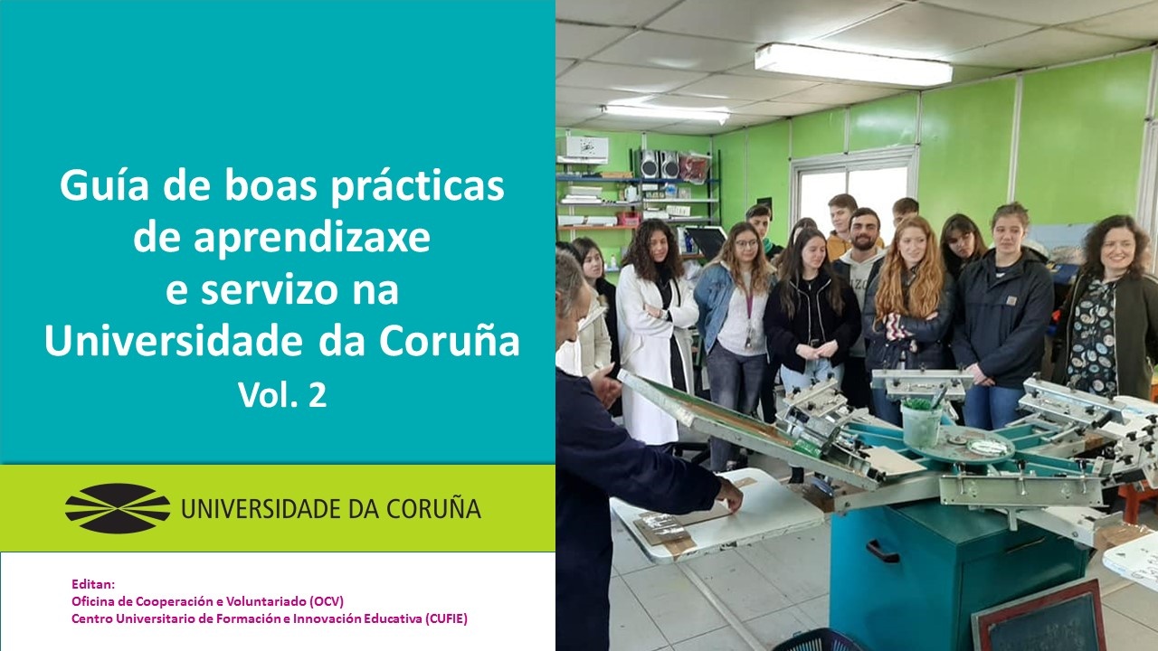 Oficina de Cooperación e Voluntariado (OCV) e Centro Universitario de Formación e Innovación Educativa (CUFIE) (ed.) (2021): Guía de boas prácticas de Aprendizaxe e Servizo na Universidade da Coruña. Volume 2. Col. Contextos Universitarios Transformadores. Número 5. Universidade da Coruña. A Coruña.