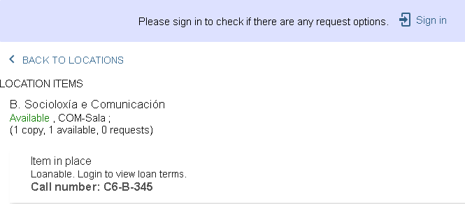Remember that if there are more than three copies of a document you won´t see them all on the listing screen and you will have to click on the yellow link below (which notifies you that there are more lines) to see the record screen. You will still have to descend one more degree by clicking on another button in case there are more than ten copies in the university because that is the maximum number of copies that this screen displays.