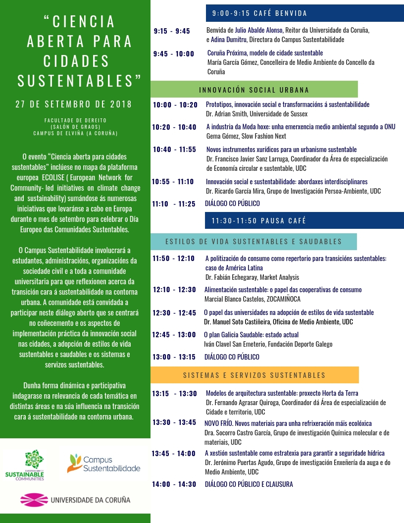 O evento “Ciencia aberta para cidades sustentables” inclúese no mapa da plataforma europea ECOLISE ( European Network for Community- led initiatives on climate change and sustainability) sumándose ás numerosas iniciativas que levaránse a cabo en Europa durante o mes de setembro para celebrar o Día Europeo das Comunidades Sustentables.
