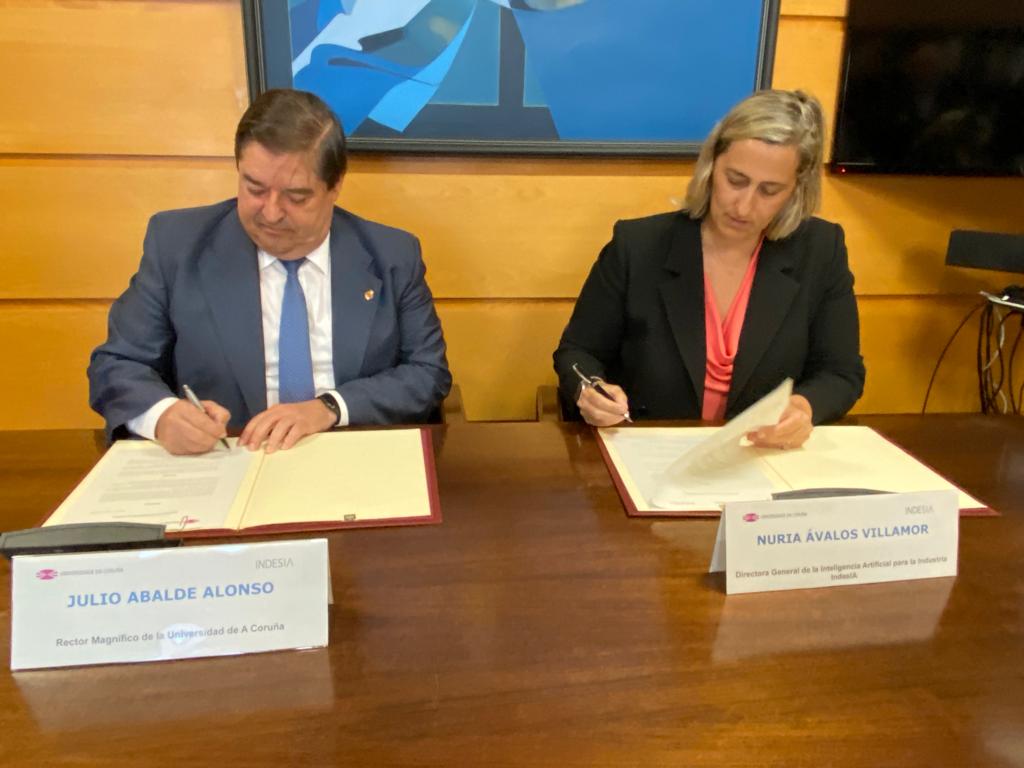 Foto: Acto de firma do convenio entre o reitor da Universidade da Coruña, Julio Abalde, e a directora xeral de IndesIA, Nuria Ávalos.