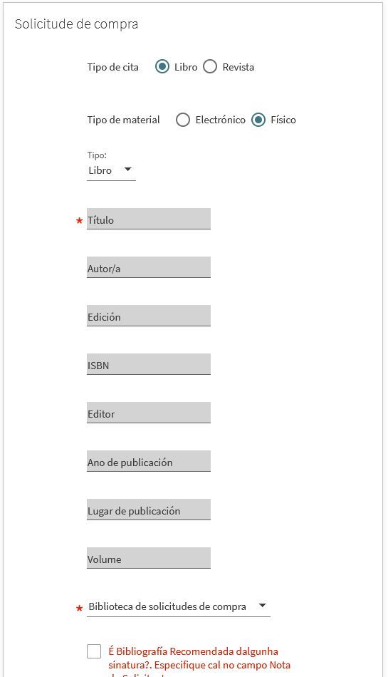 Pediravos que iniciedes sesión (PDI, alumnado e PTXAS). Unha vez dentro só teredes que cubrir o formulario. No caso do profesorado, por favor, indicade se o libro vai formar parte ou non da bibliografía recomendada e, en caso de que si, a que materia correspondería.