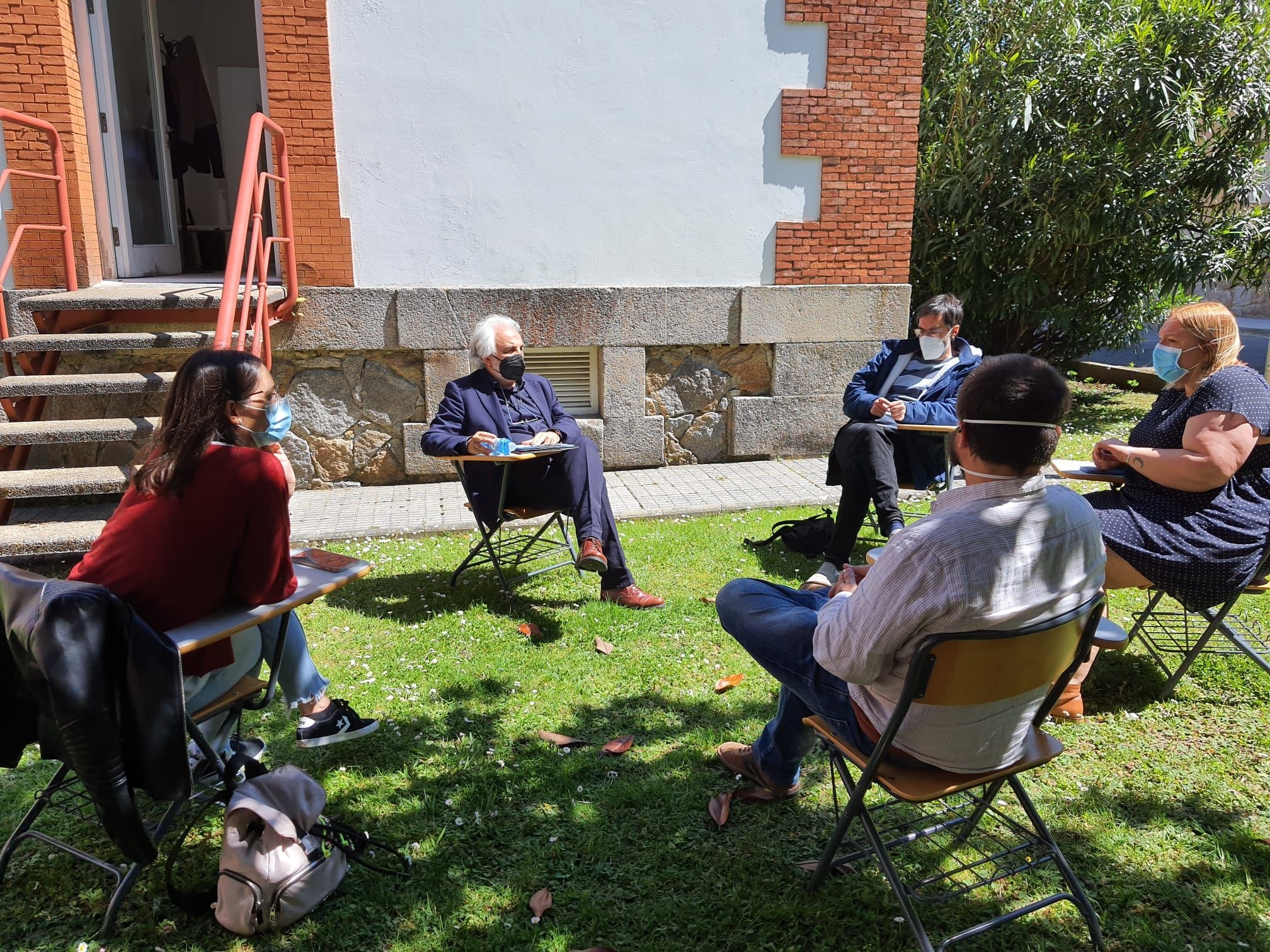 Foto: Parte do equipo da Unidade de Investigación en Intervención e Coidado Familiar (UIICF) durante unha reunión de traballo diante do Centro de Investigacións Tecnolóxicas II do Campus de Ferrol. Valentín Escudero Carranza, o segundo pola esquerda.