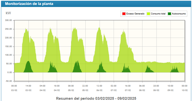 Na gráfica adxunta poden verse resultados reais da xeración en valores de potencia dos primeiros días de funcionamento, sendo a curva verde escura a xeración fronte a verde clara que sería o consumo.