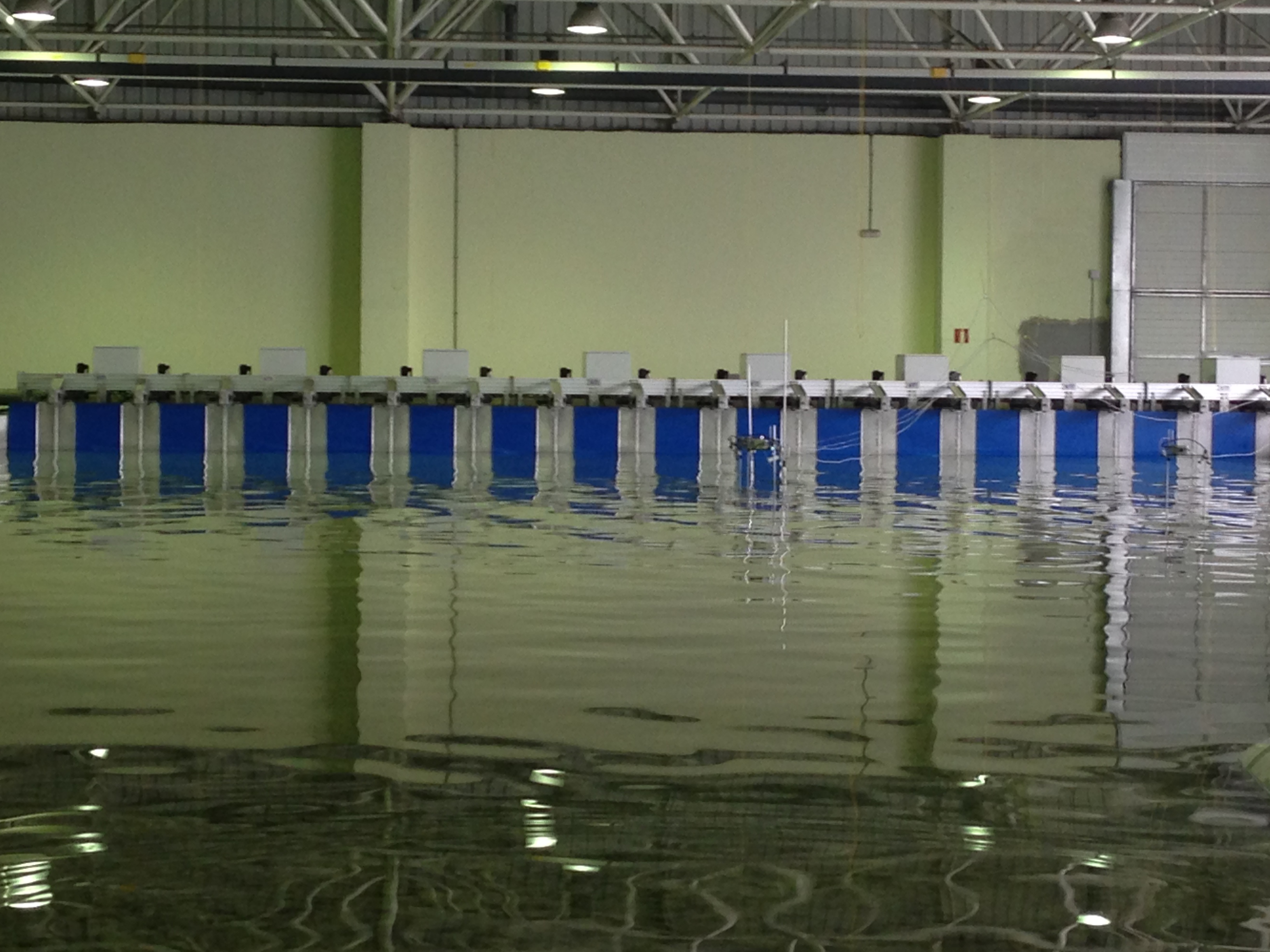 The wave basin has full dimensions of 33 x 34 x 1.2m (length, width, height), with two different wave generation systems: