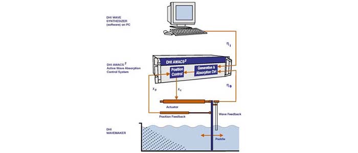 Sistema de control activo de absorción de olas, que permite un control total de las olas generadas, sin afectarle la incidencia de olas reflejadas producidas por los elementos a ensayar o el propio medio del ensayo. El sistema utiliza como referencia unos sensores alojados en la parte delantera de la pala que genera la ola, para poder responder a las necesidades del ensayo. Es capaz de trabajar tanto con olas regulares como irregulares
