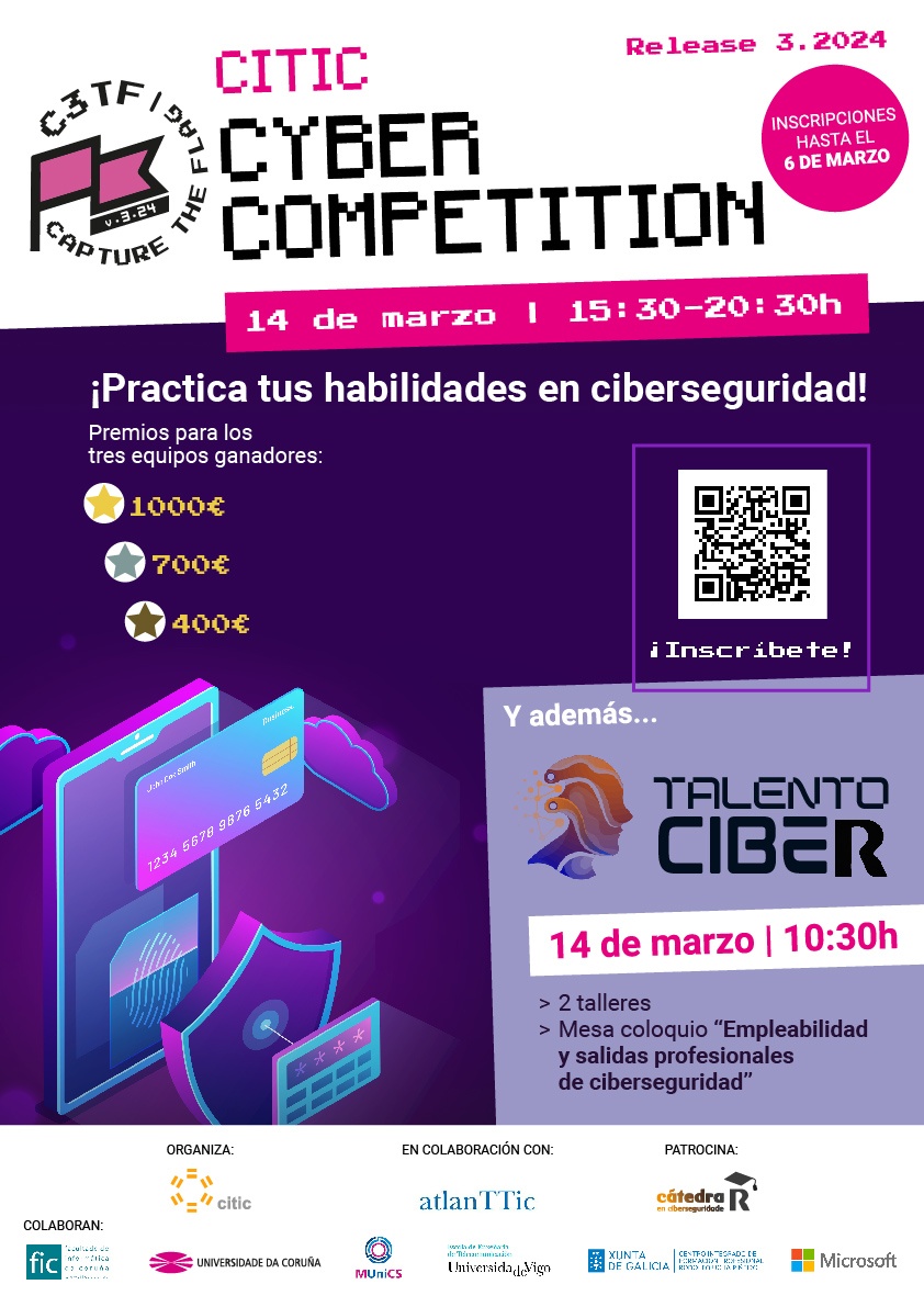 O CITIC Cyber Competition (C3TF) celébrase dentro da primeira edición do evento TalentoCibeR. A partir das 10.30, realizaranse dous talleres prácticos e unha mesa coloquio cos que se pretenden visibilizar o talento en ciberseguridade de Galicia e fomentar as novas vocacións a través do achegamento entre as empresas e os estudantes. O evento celebrarase de forma presencial e simultánea no CITIC da UDC (A Coruña) e na Escola de Enxeñería de Telecomunicacións da UVigo (Vigo).