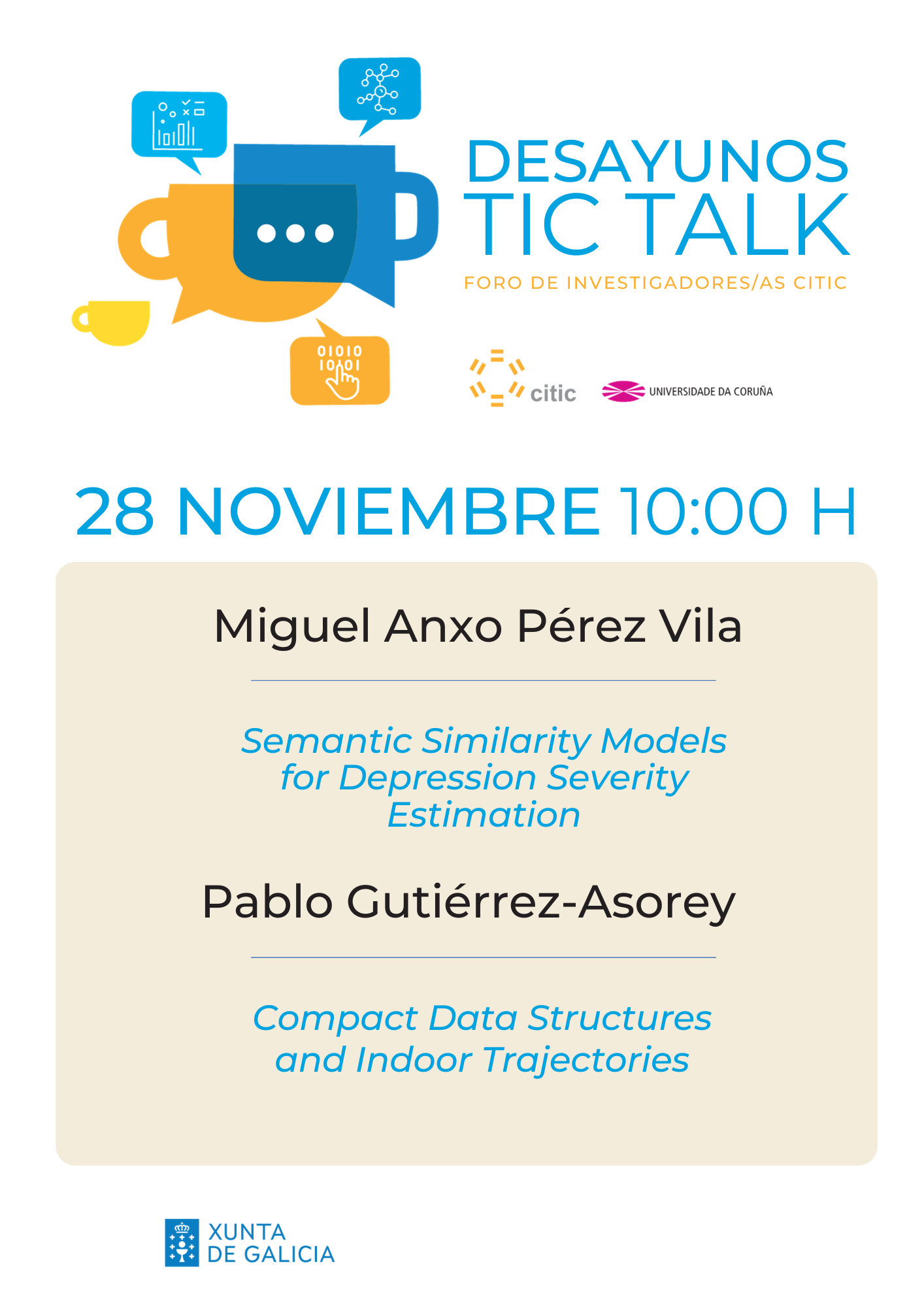A Coruña, 27 de novembro de 2023.- Este martes, 28 de novembro, ás 10:00 horas, o Centro de Investigación en Tecnoloxías da Información e as Comunicacións da Universidade da Coruña, CITIC, organiza o seu décimo sexto almorzo TIC Talk, o foro do persoal de investigación do centro.