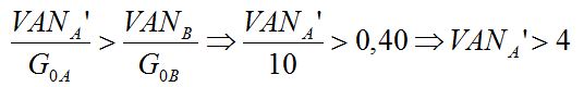 - El VAN del proyecto A podría reducirse hasta que IRA = IRB; si VANA sigue cayendo tendríamos IRA < IRB de forma que el proyecto B tendría prioridad y la solución cambiaría. Se trata por tanto de que se verifique la siguiente desigualdad:
