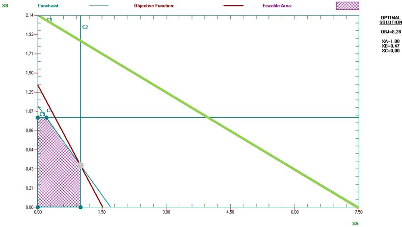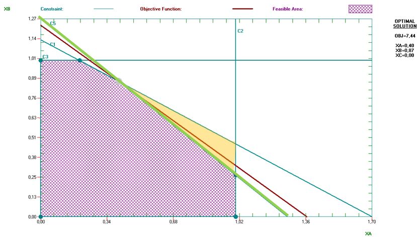 La solución actual (1 0,47) verifica esta restricción ya que 2XA+7XB+10XC = 2 · 1 + 7 · 0,47 + 10 · 0 = 5,29 < 40. La restricción no es activa, por tanto no ejerce ninguna limitación efectiva sobre la solución, y el programa òptimo no cambia.