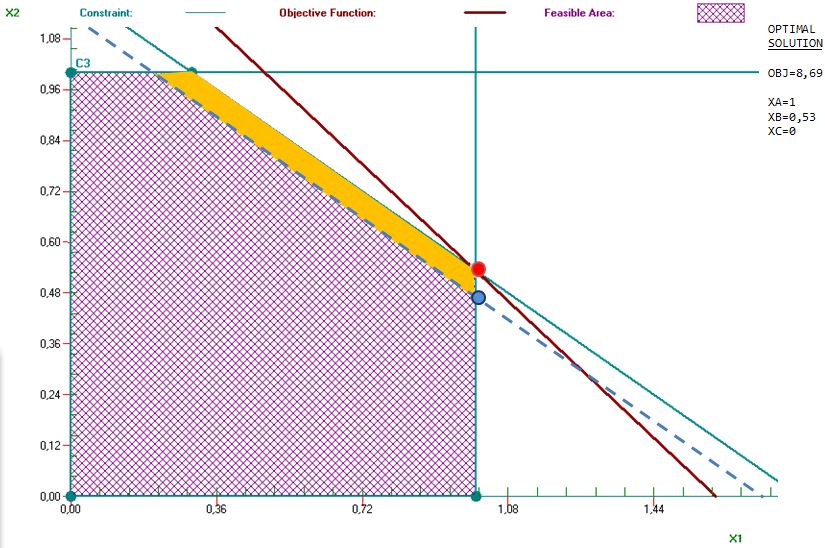 Para comprenderlo es útil recurrir a la representación gráfica de las restricciones y la zona factible. Como puede comprobar en el gráfico superior, esta restricción se intersecta con la restricción financiera inicial, precisamente, en el punto correspondiente a la solución. Esto significa que, aunque desplazásemos a la derecha la nueva restricción, la solución seguiría estando limitada por la restricción financiera inicial y por la técnica XA≤1, es decir: en este caso, cambiar una sola restricción no permite mejorar la solución, sería preciso alterar dos o más restricciones, de ahí que el precio sombra sea cero.