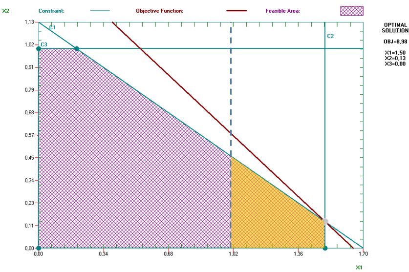 Resulta evidente que la solución en curso no verifica esta restricción, por tanto la solución óptima va a cambiar. La incorporación de la nueva restricción hace que una parte de la zona factible deje de verificar el nuevo sistema de limitaciones, y en este caso ocurre que el punto extremo de la solución óptima está precisamente en esa zona (sombreada en amarillo, en el gráfico inferior).