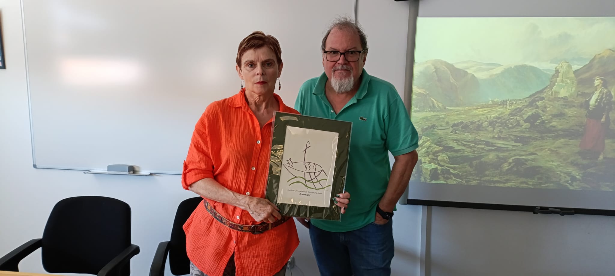 O Director do Instituto de Investigación Amergin, David Clark, facendo entrega dun agasallo a